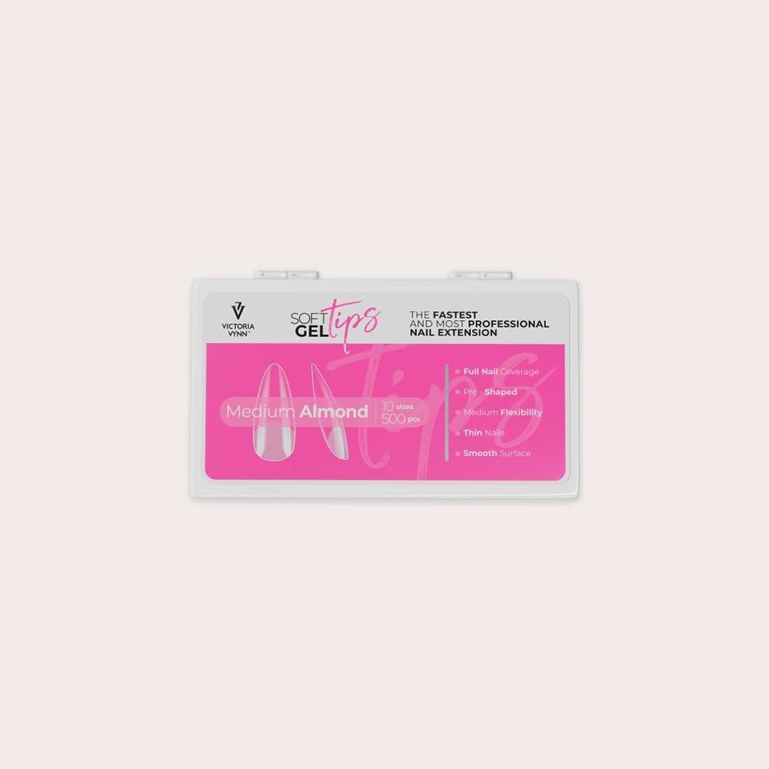 Victoria Vynn Soft Gel Tips Medium Almond son tips preformados diseñados para crear extensiones de uñas con longitud media y forma almendra, ideales para manicuras elegantes, estilizadas y de tendencia.