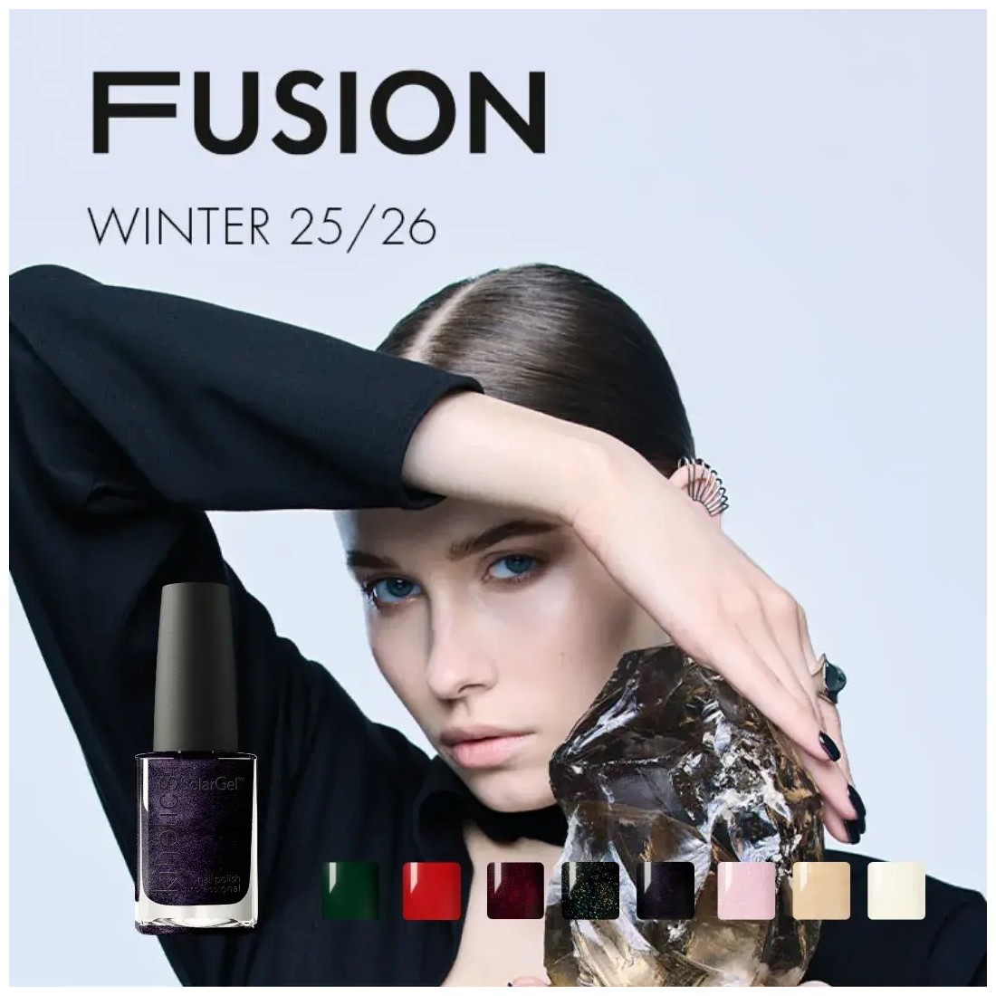 Pack completo Colección Fusion 2025 SolarGel: 8 esmaltes tradicionales, 2 tops SolarGel, display, carta de color y lookbook. Acabado tipo gel y secado al aire.