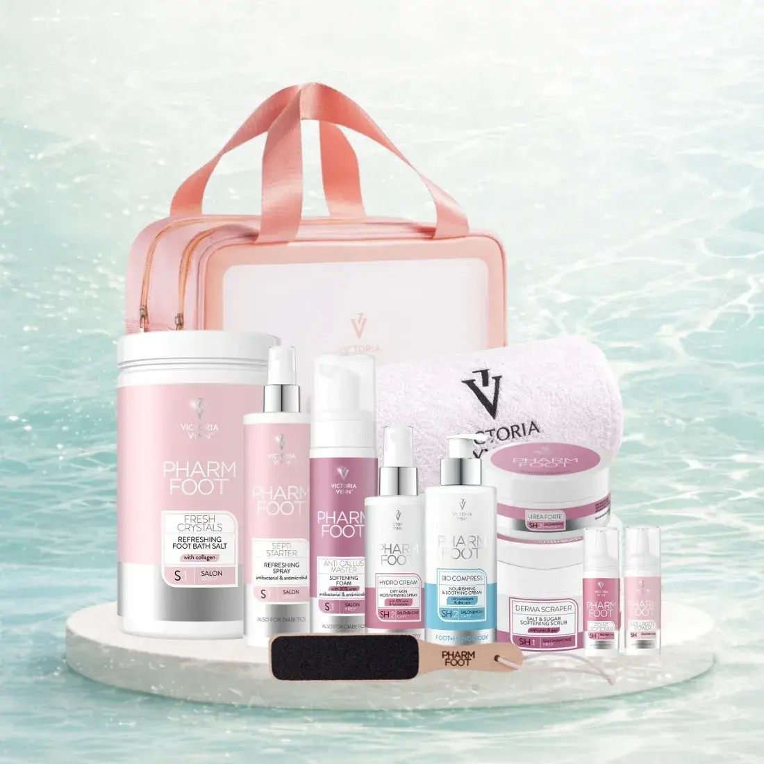 Incluye una selección estratégica de productos PHARM FOOT que permiten trabajar desde la fase de relajación y remojo hasta la regeneración final de la piel.