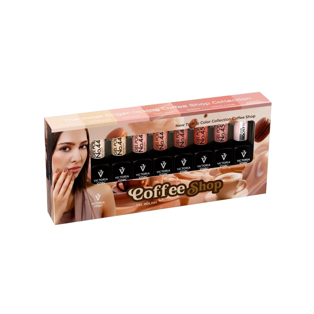 Pack colección Victoria Vynn Gel Polish Coffee Shop reúne una selección de tonos inspirados en el universo del café: nudes, beige, marrones y tonos cálidos, perfectos para manicuras elegantes, naturales y atemporales.