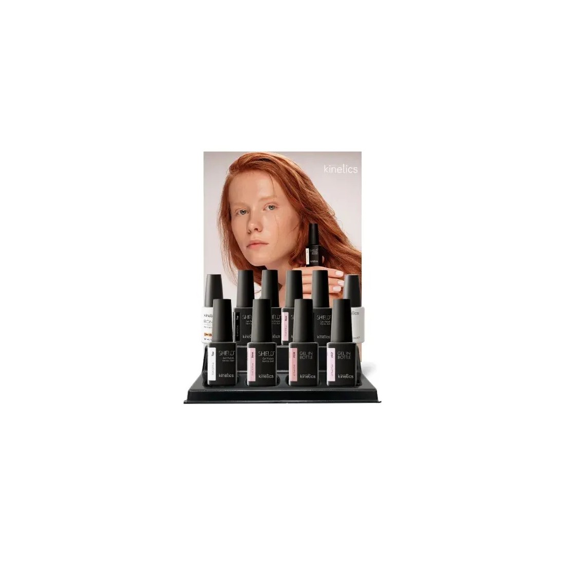 Pack de 10 productos esenciales para tu salón, incluyendo productos para preparación, construcción, esmaltes y top coats, además de un expositor y trasera de regalo. Ideal para cualquier tipo de clienta y uña.