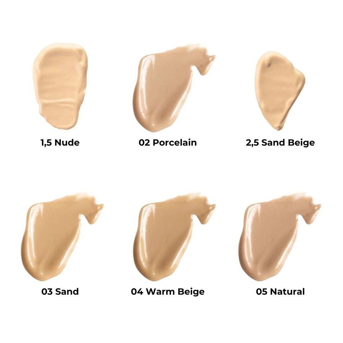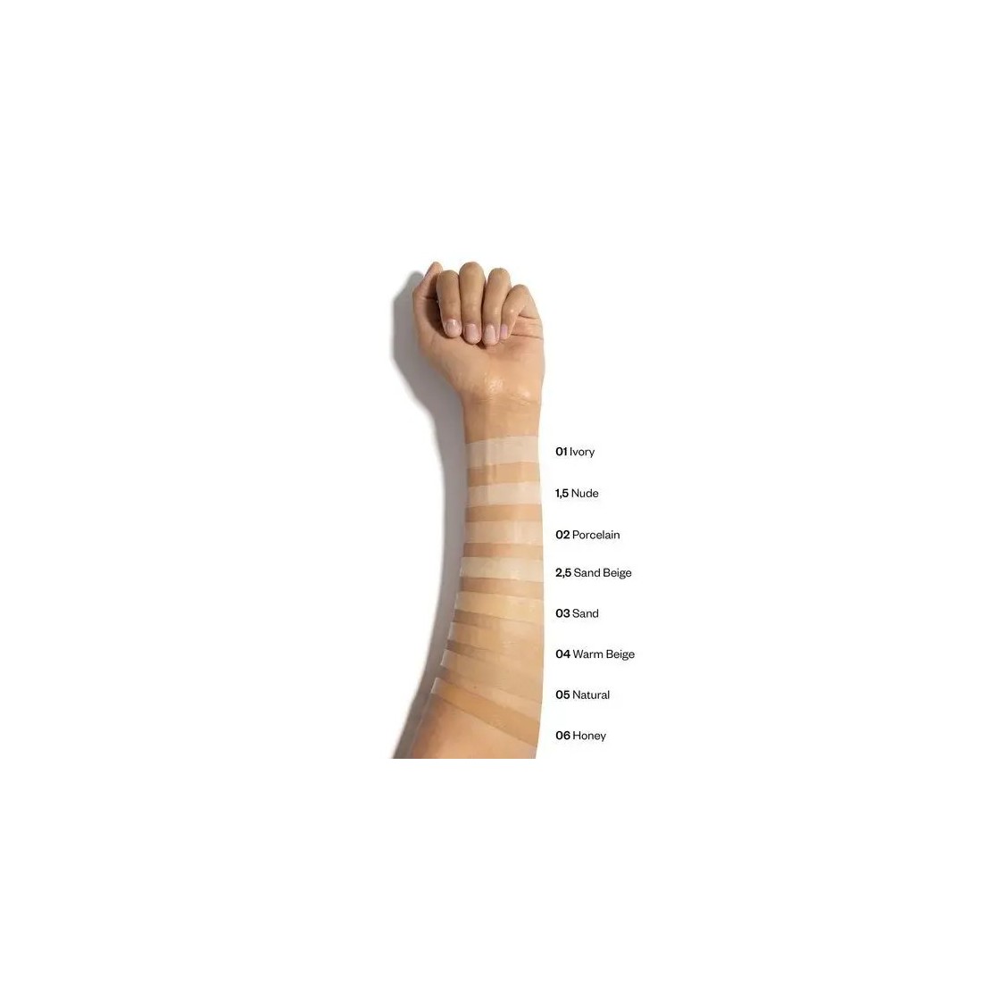 Aplica la base sobre la piel limpia con brocha, esponja o yemas de los dedos. Para mayor cobertura, añade capas adicionales donde sea necesario.