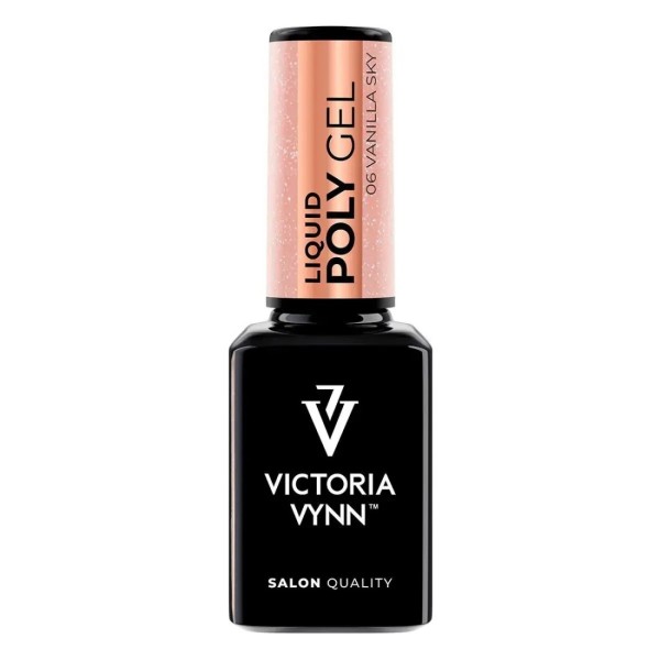 Poly Gel Liquid 06 Vanilla Sky, tono beige vainilla con destellos dorados, 15 ml, combina resistencia y flexibilidad para extensiones, retoques y técnicas "one drop", con acabado natural y duradero.